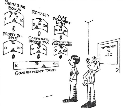 Most often the petroleum regime, one way or another, has a built-in ability to adjust the sharing of the net value of oil and gas production after the costs of exploration, development and production. For instance, income tax is only charged on net income or profit, so if oil and gas prices decline, profits decline and taxation accordingly also declines. In production sharing arrangements, the sharing of production comes only after the companies receive cost recovery payments, so a company’s share is reduced (as is the Government’s share) when prices are low.