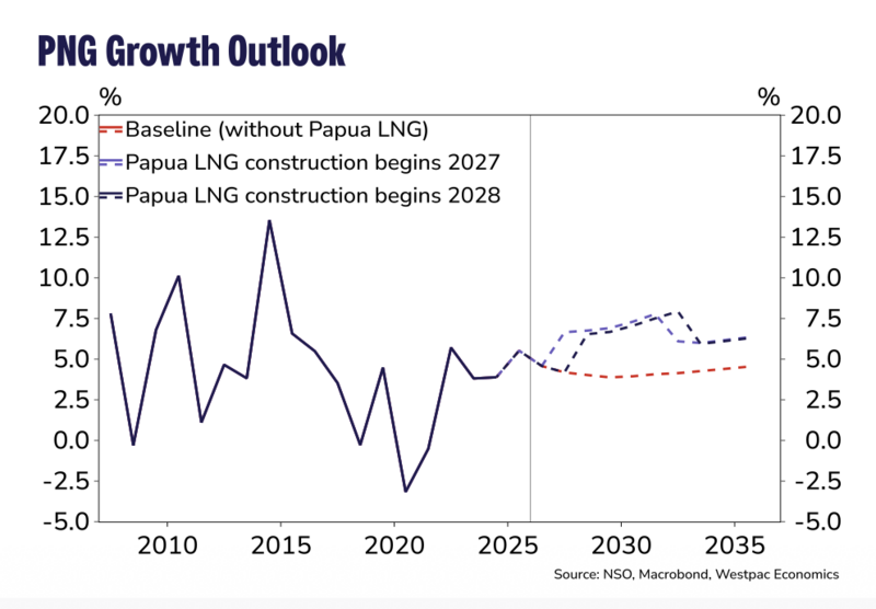 Under Westpac’s baseline scenario without Papua LNG FID, growth moderates to 4.2 percent in 2027 and 4.0 percent in 2028, stabilising around 3.9–4.1 percent over the longer term.